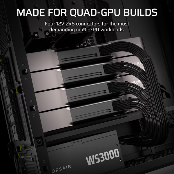 Một trong những cải tiến quan trọng nhất của CORSAIR WS3000 là việc trang bị 4 đầu 12V-2x6 (12+4 pin) – chuẩn kết nối mới dành cho card đồ họa thế hệ tiếp theo. Mỗi đầu cắm có thể cấp tới 600W, nghĩa là bộ nguồn này hoàn toàn đủ sức vận hành các GPU cao cấp nhất dành cho trí tuệ nhân tạo, deep learning hay dựng hình 3D chuyên nghiệp.
