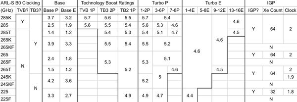 Tốc độ xung nhịp sẽ đạt mức tối đa lên đến 5.7 GHz trên phiên bản cao cấp nhất (Core Ultra 9 285K), và mặc dù giới hạn TDP được cho là vẫn giữ nguyên (125W PL1 và 253W PL2), mức tiêu thụ điện năng thực tế được cho là thấp hơn 100W so với các vi xử lý Raptor Lake thế hệ hiện tại.