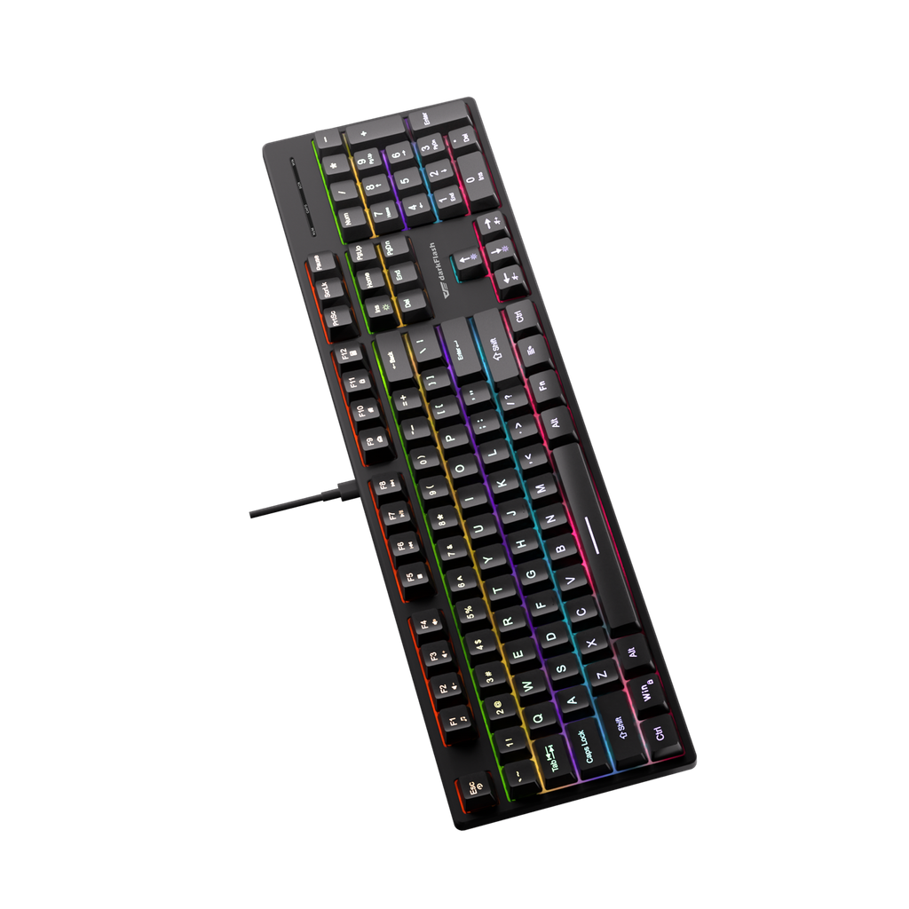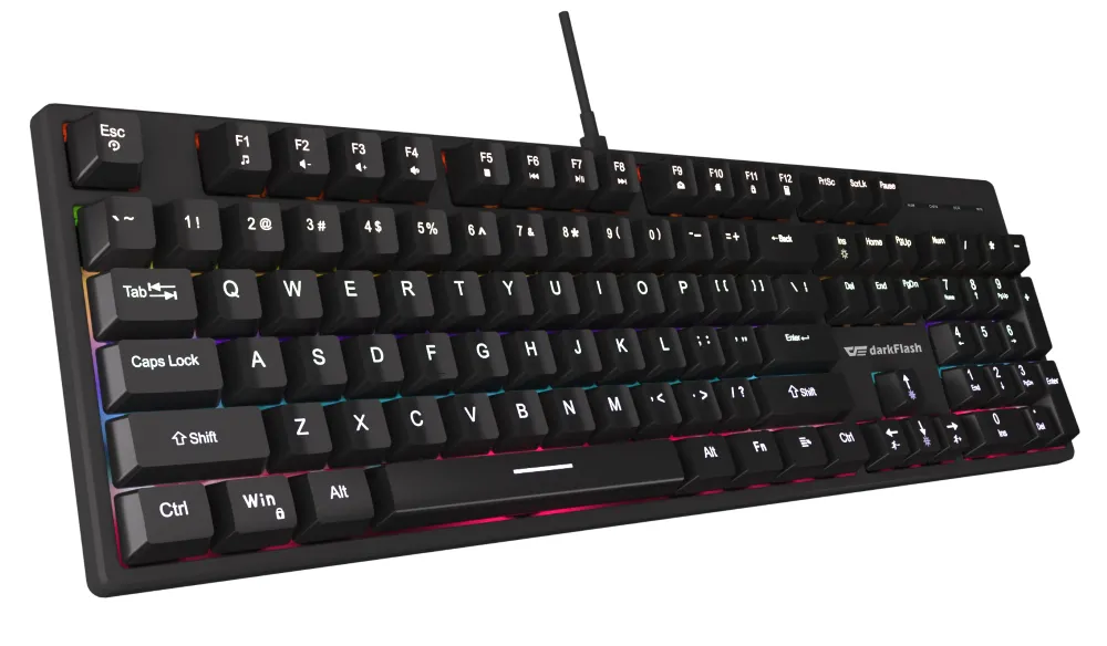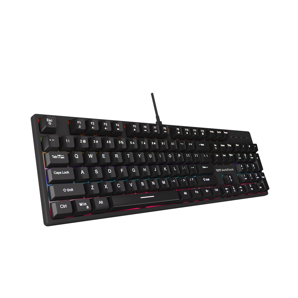 Darkflash DK100 sở hữu vẻ ngoài đen nhám tinh tế, khung phím chắc chắn cùng keycap ABS cao cấp, mang đến độ bền cao và khả năng chống mài mòn hiệu quả. Layout fullsize giúp thao tác nhanh gọn, hỗ trợ tối đa cho công việc văn phòng hay các tựa game yêu cầu nhiều phím chức năng.
