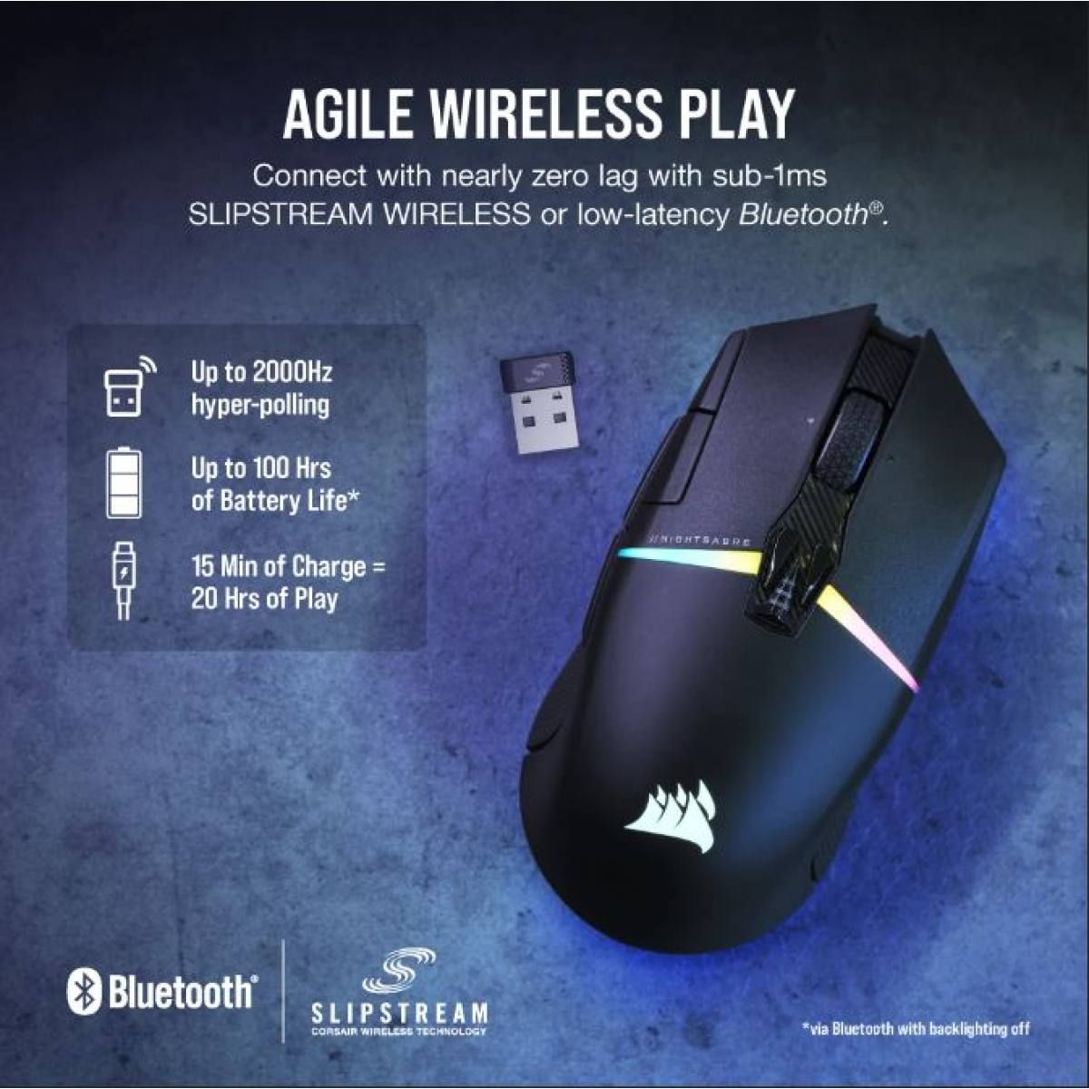 Corsair NightSabre có thời lượng pin lên đến 100 giờ cho một lần sạc. Thiết bị hỗ trợ sạc nhanh với 15 phút sạc mang đến 20 giờ sử dụng. Chuột có 7 vùng chiếu sáng RGB và điều này có thể được tùy chỉnh.