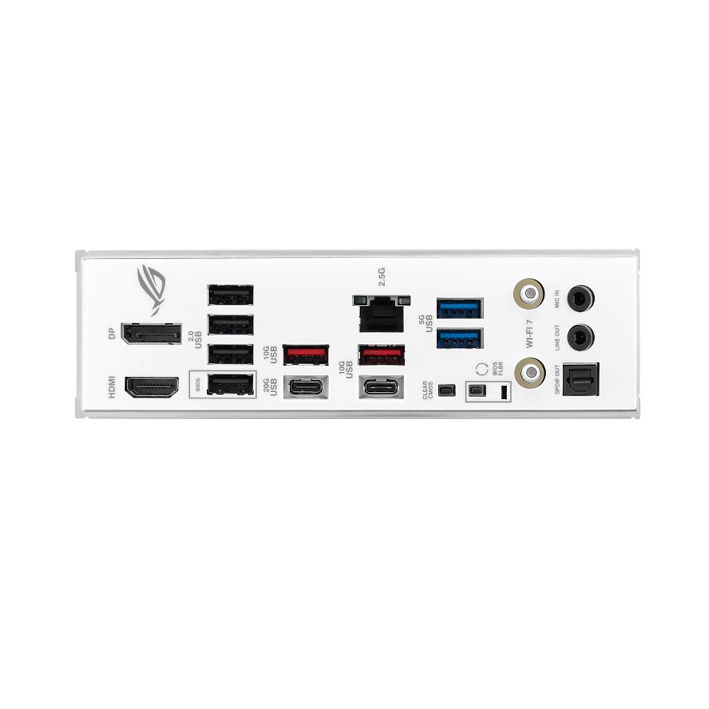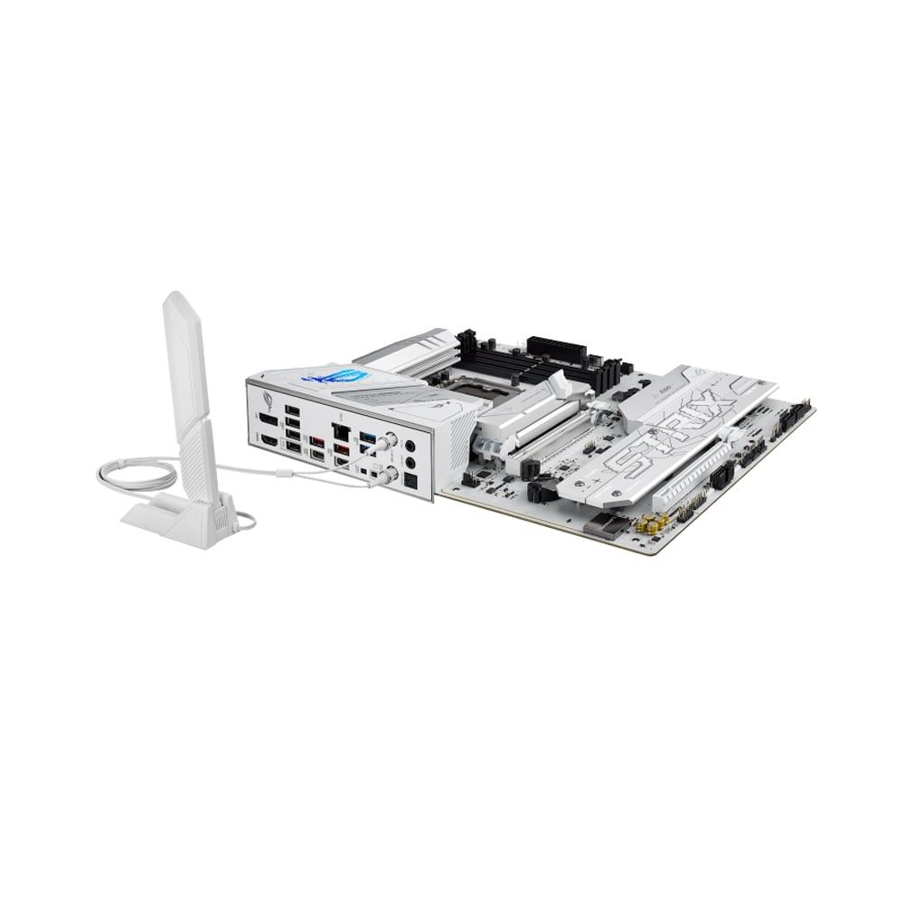 ROG STRIX B860-A mang ngôn ngữ thiết kế đặc trưng của dòng STRIX, kết hợp giữa các chi tiết bo mạch chất lượng cao và màu trắng thanh lịch – cực kỳ phù hợp với xu hướng build PC “all-white” đang rất được yêu thích. Tấm chắn I/O sẵn, các tản nhiệt phủ lớp sơn trắng nhám cao cấp tạo nên một tổng thể đẹp mắt, nổi bật trong mọi bộ máy.