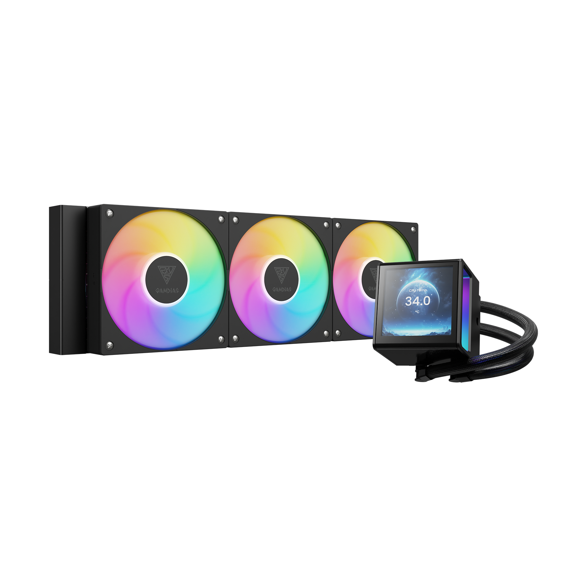 Bộ tản nhiệt chất lỏng CHIONE P5-360 có màn hình LCD IPS 3,4" tùy chỉnh để hiển thị thông tin thời gian thực, hình ảnh và ảnh GIF động. Kết hợp với bộ tản nhiệt 360mm mạnh mẽ và ba quạt ARGB PWM 120mm, mang lại hiệu suất làm mát hàng đầu, đảm bảo hệ thống của bạn luôn mát mẻ và thời trang.